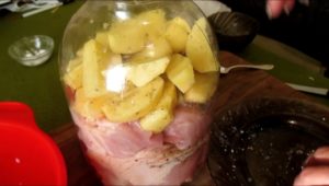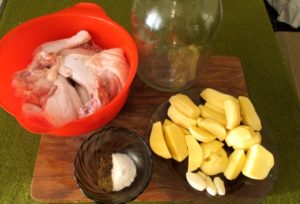 Приготовьте трех литровую банку. Курицу разрежьте на произвольные части. Очищенный картофель разрежьте на четвертинки. Смешайте вместе соль, перец и приправы.