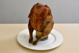 Приготовьте противень или подставку под банку с курицей. Поставьте на нее банку и наденьте на банку курицу. Сверху кожу у курицы необходимо закрыть и закрепить зубочисткой, чтобы пары воды с приправами оставались внутри.