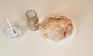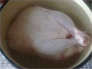 Тушку курицы промойте проточной водой. Возьмите кастрюлю, чтоб в ней свободно поместилась курица, налейте в нее воду и растворите 3 столовые ложки соли, затем опустите в нее курицу и оставьте на 1 час.