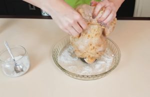 Тушку курицы промойте и просушите. Хорошо натрите курицу специями, не забывая промазать и внутри.