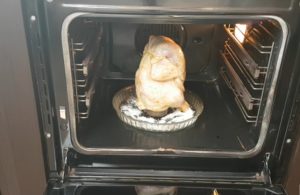 Курицу поставьте в холодную духовку так, чтобы она верхом не задевала верхнюю стенку духового шкафа. Включите духовку на 180 градусов и запекайте 1,5-2 часа до готовности.