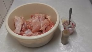 Курицу промойте и разрежьте на порционные куски. Посолите, поперчите, по желанию добавьте любимые специи и хорошо перемешайте.