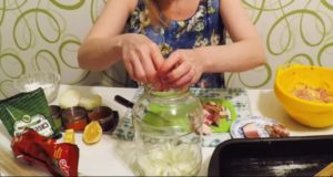 Пока курица маринуется, нашинкуйте лук полукольцами. И теперь можно начинать складывать ингредиенты в банку. Первым слоем будет лук, потом курица, чередуйте и таким образом заполните банку.