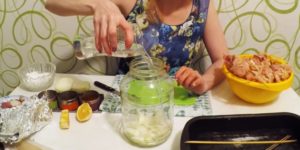 Начинайте выкладывать в банку курицу пересыпая каждый слой смесью приправ с солью и крупно порезанным чесноком.