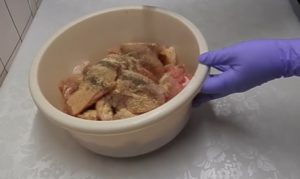 Солью и специями натирают не все кусочки курицы. В процессе приготовления соль и специи опускаются на дно банки и для того, чтоб вкус блюда был равномерным – нижние кусочки мяса не солят.