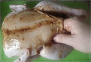 Приготовленным соусом обмажьте хорошо курицу снаружи и внутри.
