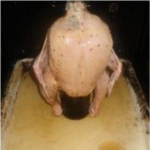 Курицу аккуратно оденьте на бутылку с пивом, а бутылку поставьте на противень. Кстати на противень налейте остатки пива смешанные с водой.