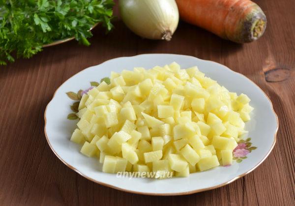 - Начинать приготовления следует с подготовки овощей. Их необходимо тщательно вымыть и очистить от кожицы. Клубни картофеля нужно внимательно осмотреть и удалить с их поверхности все глазки. Далее следует измельчить морковь и картофель небольшими кубиками, а лук – средними полукольцами.
