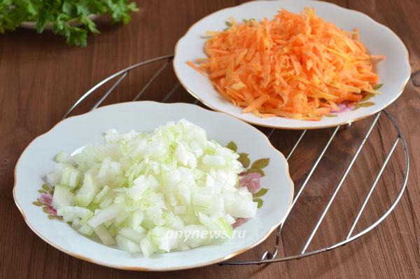 3. Лук нарезаем мелко, морковь крупно натираем.
