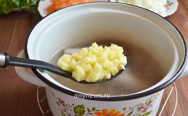 - В наш суп добавляем овощи, которые мы подготовили: картофель, лук и морковь.