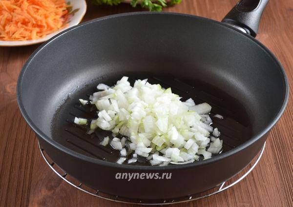 5. В масло на сковороду выкладываем измельченный лук и жарим 3-4 минуты, помешивая, пока не станет мягким.