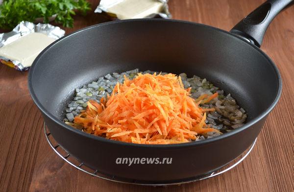 6. Отправляем крупно натертую морковку, накрываем и жарим, помешивая, 3-4 мин.