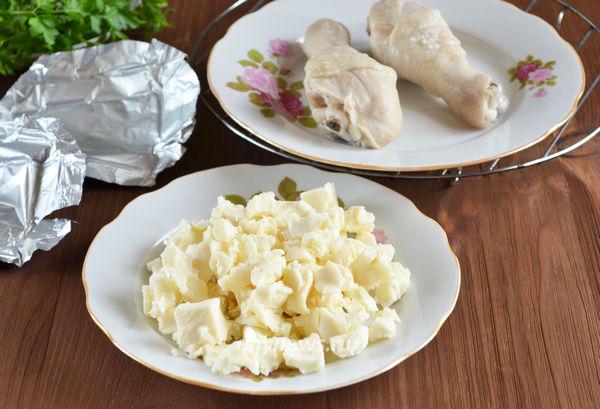 7. Готовые ножки вынимаем из бульона и остужаем. С плавленых сырков удаляем упаковку, измельчаем пальцами или нарезаем ножом на кубики.