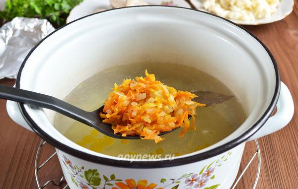 8. В бульон с картошкой отправляем обжаренные овощи, готовим 2-3 минуты.