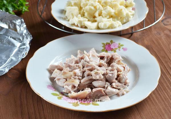 - Очищаем грудку от кожицы, нарезаем и отвариваем. Ждем около 25 минут, филе должно стать мягким.