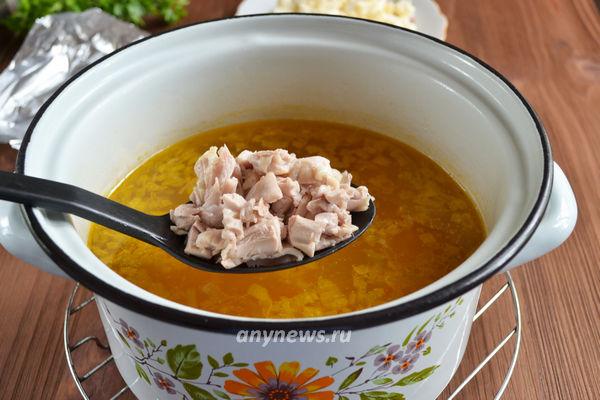 10. Выкладываем подготовленные кусочки курицы в суп.